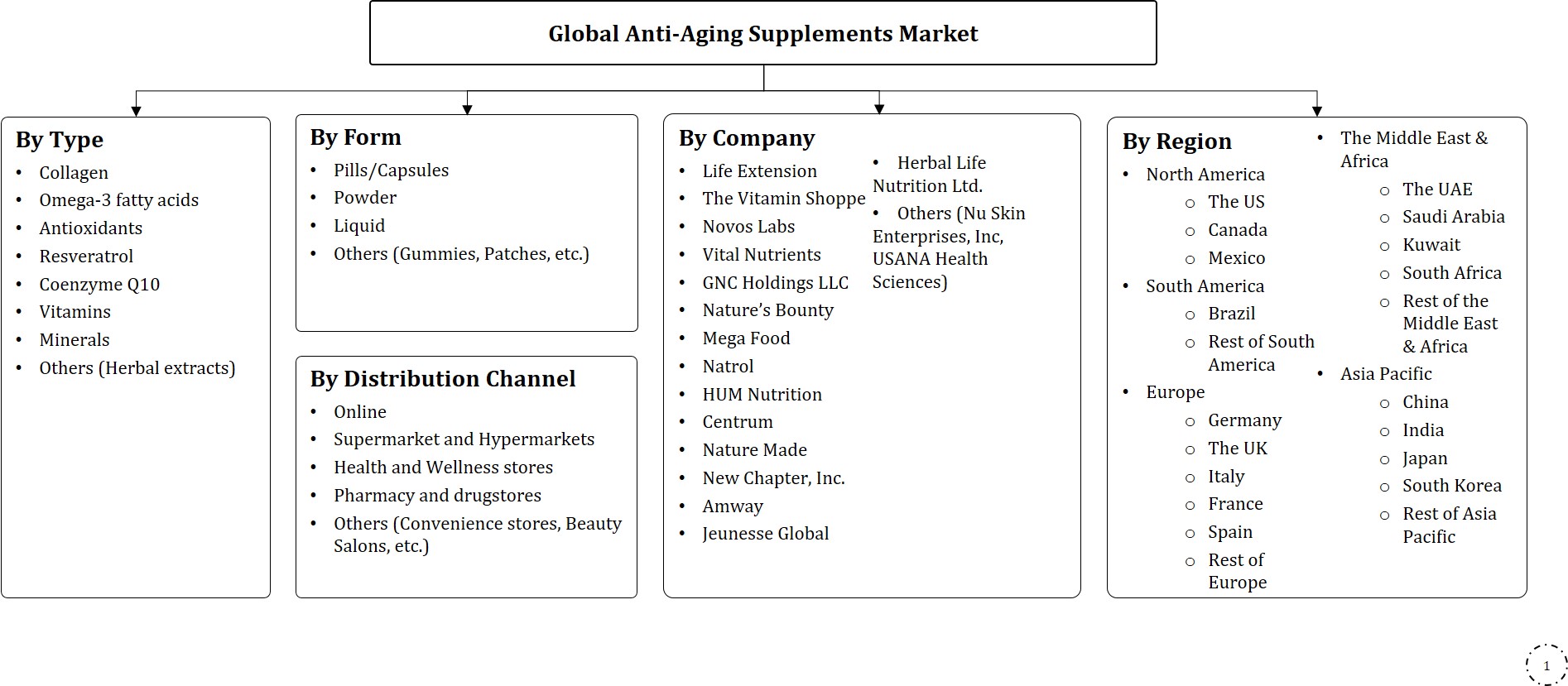 By Type Collagen Omega-3 fatty acids Antioxidants Resveratrol Coenzyme Q10 Vitamins Minerals Others (Herbal extracts), By Form Pills/capsules Powder Liquid Others (Gummies, Patches......, etc.), By Distribution Channel Online Supermarkets and hypermarkets Health and wellness stores Pharmacy and drugstores Others (Convenience stores, Beauty salons, etc.), By Region North America South America Europe The Middle East & Africa Asia-Pacific, By Company (Life Extension The Vitamin Shoppe Novos Labs Vital Nutrients GNC Holdings LLC Nature’s Bounty MegaFood Natrol HUM Nutrition Centrum Nature Made New Chapter, Inc. Amway Jeunesse Global Herbalife Nutrition Ltd. Others (Nu Skin Enterprises, Inc., USANA Health Sciences) Read more