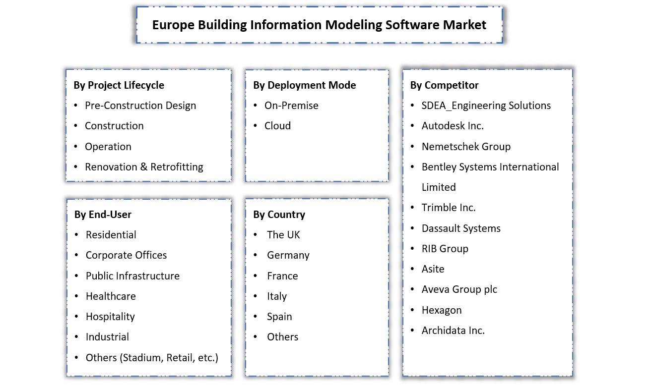 By Deployment Mode (On Premises, Cloud-Based), By Project Lifecycle (Pre-Construction Design, Construction, Operation, Renovation & Retrofitting), By End User (Residential, Corpora......te Offices, Public Infrastructure, Healthcare, Hospitality, Industrial, Others (Stadium, Retail, etc.)), By Country (The UK, Germany, France, Italy, Spain, Others), By Company (SDEA_Engineering Solutions, Autodesk Inc., Nemetschek Group, Bentley Systems International Limited, Trimble Inc., Dassault Systems, RIB Group, Asite, Aveva Group plc, Hexagon, Archidata Inc.) Read more