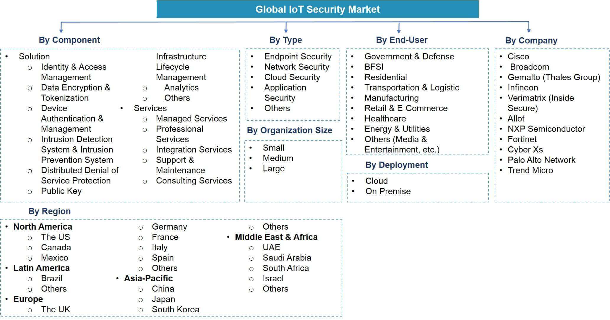 By Components (Solution [Identity & Access Management, Data Encryption & Tokenization, Device Authentication & Management, Intrusion Detection System & Intrusion Prevention System,...... Distributed Denial of Service Protection, Public Key Infrastructure Lifecycle Management, Analytics, Others], Services [Managed Services, Professional Services, Integration Services, Support & Maintenance, Consulting Services]), By Type (Endpoint Security, Network Security, Cloud Security, Application Security, Others), By Deployment (Cloud, On-Premise), By Organization (Small, Medium, Large), By End-User (Government & Defense, BFSI, Residential, Transportation & Logistic, Manufacturing, Retail & E-Commerce, Healthcare, Energy & Utilities, Others (Media & Entertainment, etc.)), By Region (North America, South America, Europe, Asia-Pacific, Middle East & Africa), By Country (US, Canada, Mexico, Brazil, UK, Germany, France, Italy, Spain, China, Japan, South Korea, Israel, UAE, Saudi Arabia, South Africa), By Company (Cisco, Broadcom, Gemalto (Thales Group), Infineon, Verimatrix (Inside Secure), Allot, NXP Semiconductor, Fortinet, Cyber Xs, Palo Alto Network, Trend Micro etc.) Read more