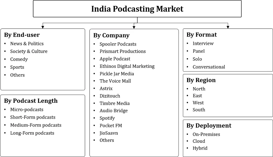 India Podcasting Market - By Format (Interview, Panel, Solo, Conversational), By Deployment (On-Premises, Cloud, Hybrid), By End-user (News & Politics, Society & Culture, Comedy,......Sports, Others), By Podcast Length (Micro-podcasts, Short-Form podcasts, Medium-Form podcasts, Long-Form podcasts) and Others Read more