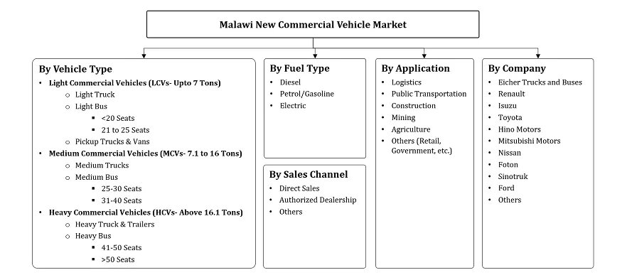 Malawi New Commercial Vehicle Market - By Vehicle Type (Light Commercial Vehicles (LCVs- Upto 7 Tons) [Light Truck, Light Bus, Pickup Trucks & Vans], Medium Commercial Vehicles (MC......Vs- 7.1 to 16 Tons) [Medium Trucks, Medium Bus], Heavy Commercial Vehicles (HCVs- Above 16.1 Tons) [Heavy Truck & Trailers, Heavy Bus]), By Fuel Type (Diesel, Petrol/Gasoline, Electric), By Application (Logistics, Public Transportation, Construction, Mining, Agriculture, Others (Retail, Government, etc.)), By Sales Channel (Direct Sales, Authorized Dealership, Others) and Others Read more