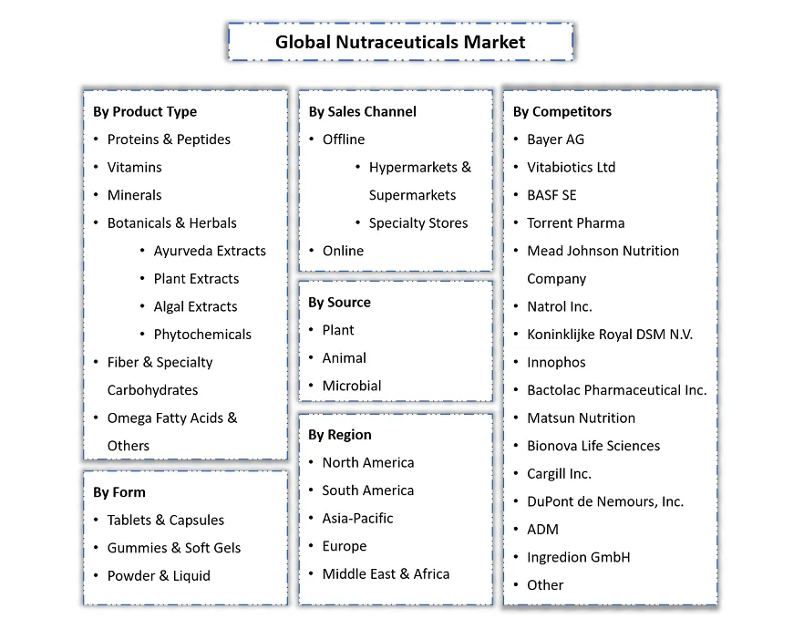 Nutraceuticals Market - By Product Type (Dietary Supplements [Proteins & Peptides, Vitamins, Minerals, Botanicals & Herbals {Ayurveda Extracts, Plant Extracts, Algal Extracts, And......Phytochemicals}, Fibre & Specialty Carbohydrates, Omega Fatty Acids & Others]), By Source (Plant, Animal, Microbial), By Form (Tablets & Capsules, Gummies & Soft Gels, Powder & Liquid), By Sales Channel (Offline Store-Based [Supermarkets & Hypermarkets, Specialty Stores], Online) and Others Read more
