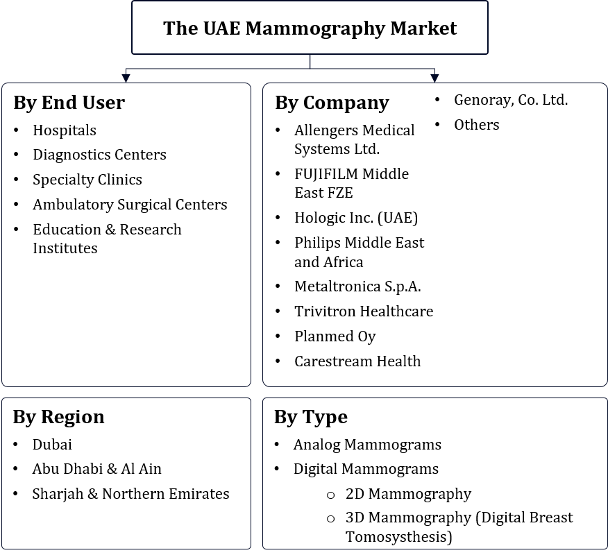- Leading mammography companies in the UAE are Hologic Inc., Siemens Healthcare LLC, Philips Middle East and Africa FZ-LLC, FUJIFILM Middle East FZE, Carestream Health Inc., Allengers Medical Systems Limited, Trivitron Healthcare Private Limited, Planmed Oy, Metaltronica S.p.A., Genoray Co., Ltd., and Others.