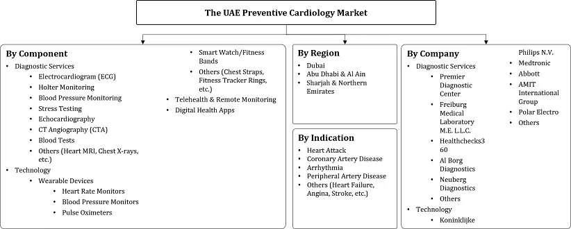 UAE Preventive Cardiology Market Report - By Component (Diagnostic Services, [Electrocardiogram (ECG), Holter Monitoring, Blood Pressure Monitoring, Stress Testing, Echocardiograph......y, CT Angiography (CTA), Blood Tests, Others (Chest MRI, Chest X-Ray, etc)], [Technology, {Wearable Devices, Heart Rate Monitors, Blood Pressure Monitors, Pulse Oximeters, Smart Watch/Fitness Bands, Others (Chest Straps, Fitness Tracker Rings, etc.)], TeleHealth & Remote Monitoring, Digital Health Apps]), By Indication (Heart Attack, Coronary Artery Disease, Arrhythmia, Peripheral Artery Disease, Others (Heart Failure, Angina, Stroke, etc.)), Others Read more