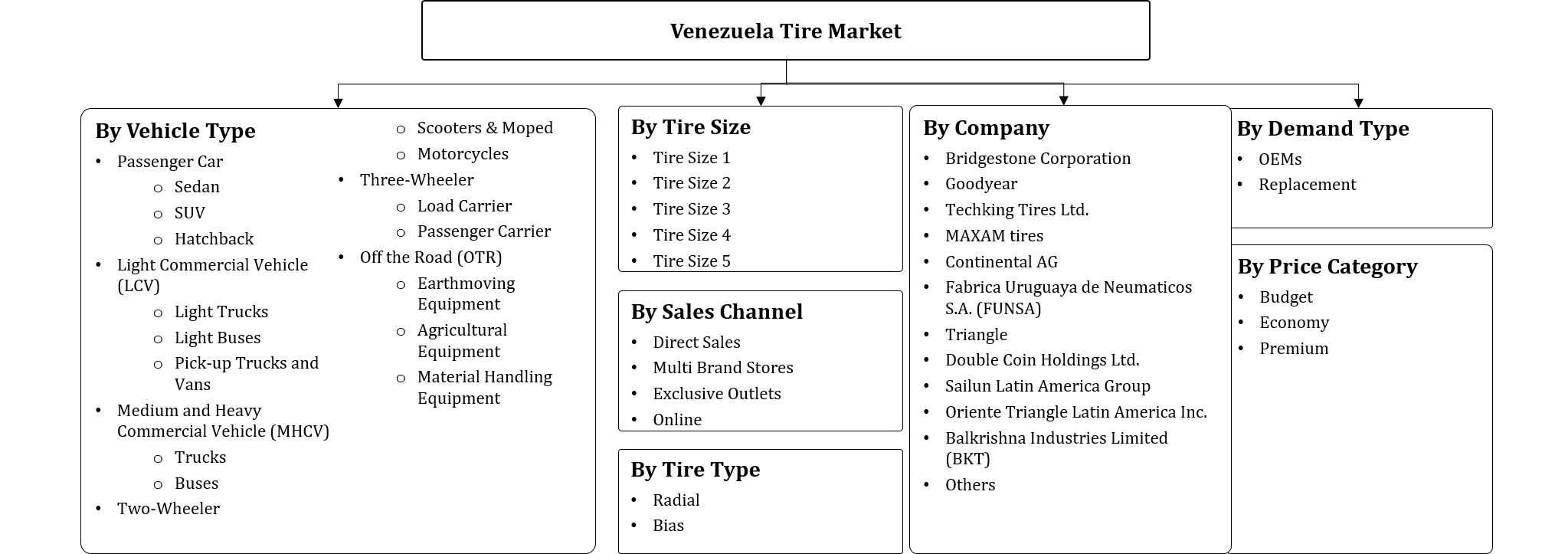 Venezuela Tire Market - By Vehicle Type (Passenger Car, Light Commercial Vehicle (LCV), Medium and Heavy Commercial Vehicle (MHCV), Two-Wheeler, Three-Wheeler, Off the Road (OTR)),......ByDemand Type (OEMs, Replacement), By Price Category (Budget, Economy, Premium), By Tire Type (Radial, Bias), By Sales Channel (Direct Sales, Multi Brand Stores, Exclusive Outlets, Online), By Tire Size (Tire Size 1, Tire Size 2, Tire Size 3, Tire Size 4, Tire Size 5), and Others Read more