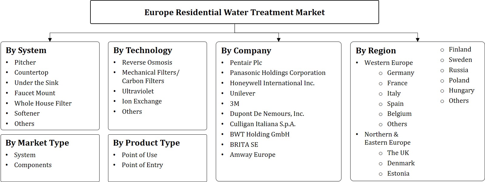 By Market Type (System, Components), By Technology (Reverse Osmosis, Mechanical Filters/ Carbon Filters, Ultraviolet, Ion Exchange), By System (Pitcher, Countertop, Under the Sink, Faucet Mount, Whole... ... Faucet Mount, Whole House Filter, Softener), By Product Type (Point-of-Use, Point-of-Entry), By Countries (Germany, France, Spain, Italy, Belgium, the UK, Denmark, Estonia, Finland, Sweden, Russia, Poland, Hungary), By Competitors (Honeywell, Pentair, Panasonic, Unilever, 3M, Culligan, AO Smith, Brita GmBH, BWT, DuPont) Read more
