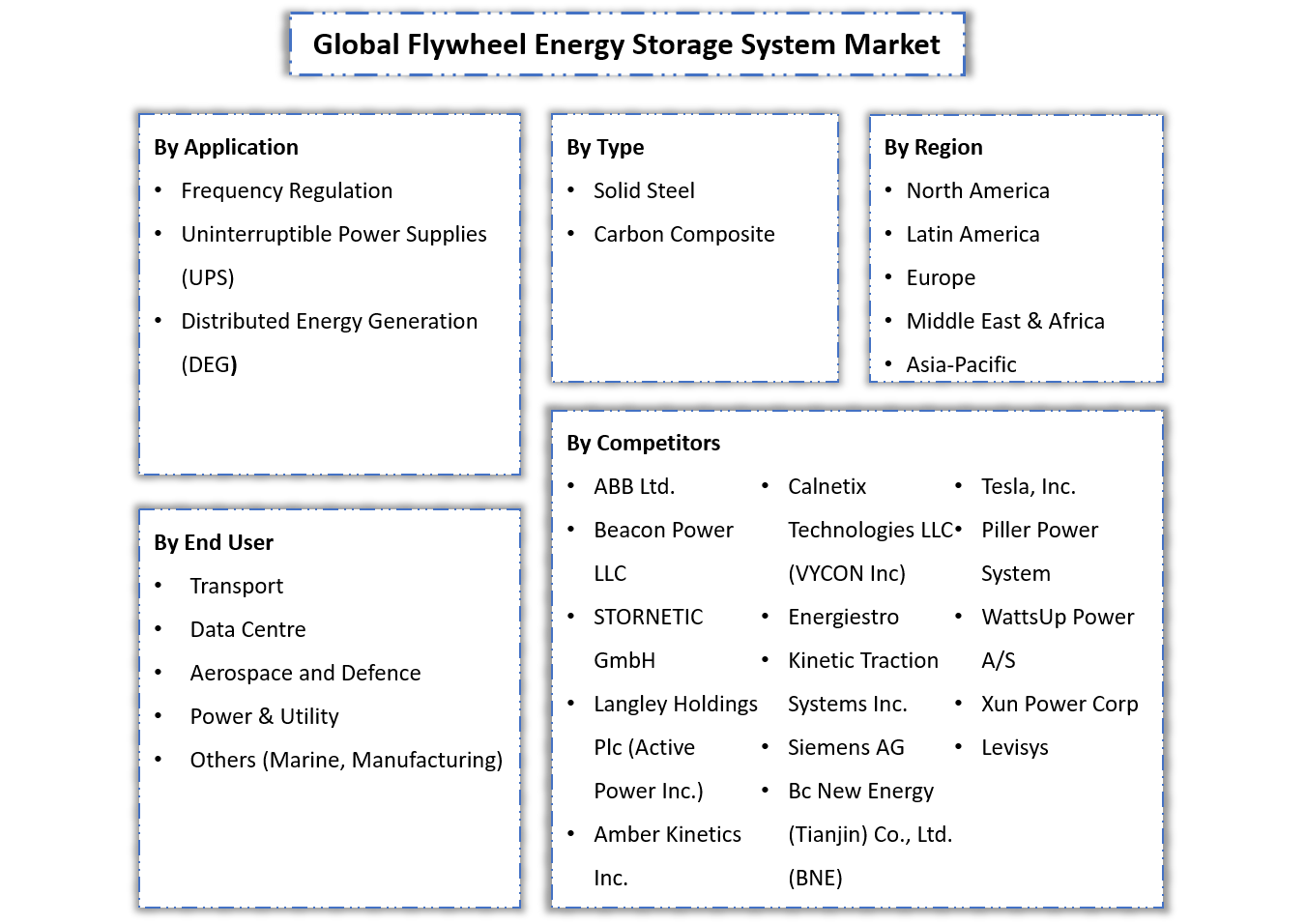 By Type (Solid Steel, Carbon Composite), By Application (Frequency Regulation, Uninterruptible Power Supplies (UPS), Distributed Energy Generation (DEG)), By End User (Transport, Data Centre, Aerospac... ... ata Centre, Aerospace and Defence, Power & Utility, Others (Marine, Manufacturing)), By Region (North America, South America, Europe, The Middle East and Africa, Asia-Pacific), By Company (ABB Ltd., Beacon Power LLC, STORNETIC GmbH, Langley Holdings Plc (Active Power Inc.), Amber Kinetics Inc., Calnetix Technologies LLC (VYCON Inc), Energiestro, Kinetic Traction Systems Inc., Siemens AG, Bc New Energy (Tianjin) Co., Ltd. (BNE), Tesla, Inc., Piller Power System, WattsUp Power A/S, Xun Power Corp, Levisys., Others) Read more