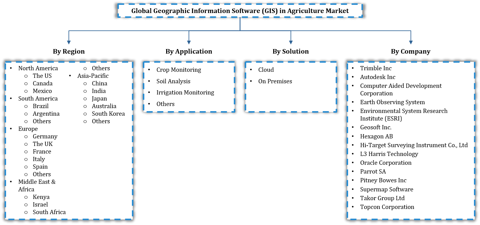 By Application (Crop Monitoring, Soil Analysis, Irrigation Monitoring, Others), By Solution (Cloud, On Premise), By Region (North America, South America, Europe, Asia-Pacific, Middle East & Africa), B... ... le East & Africa), By Country (US, Canada, Brazil, Argentina, Spain, UK, Germany, France, Italy, China, India, Japan, South Korea, Australia, Israel, South Africa, Kenya), By Company (Trimble Inc, Autodesk Inc, Computer Aided Development Corporation, Earth Observing System, Environmental System Research Institute (ESRI), Geosoft Inc., Hexagon AB, Hi-Target Surveying Instrument Co., Ltd, L3 Harris Technology, Oracle Corporation, Parrot SA, Pitney Bowes Inc, Supermap Software, Takor Group Ltd, Topcon Corporation. etc.) Read more