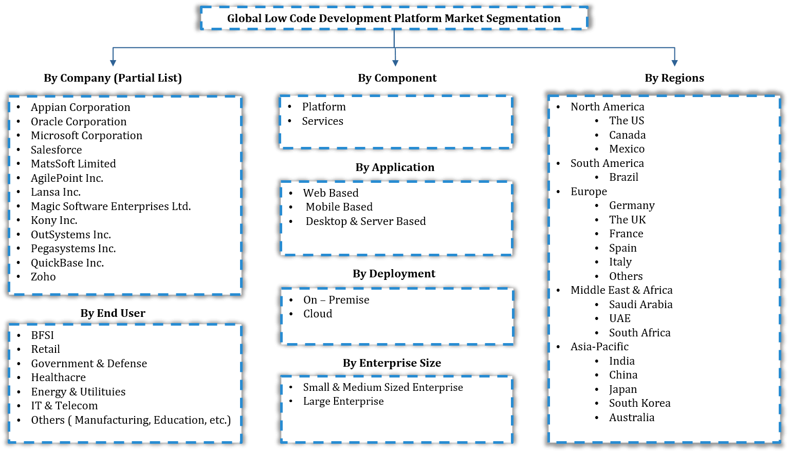 By Component (Platform, Services), By Organization Size (Small & Medium-Sized Enterprises, Large Enterprises), By Application (Web-Based, Mobile Based, Desktop and Server Based), By Deployment Type (O... ... y Deployment Type (On Premise, Cloud), By End-User (BFSI, Retail, Government & Defense, Healthcare, Energy & Utilities, IT & Telecom, Others (Manufacturing, Education, etc.)), By Region (North America, South America, Europe, Asia-Pacific, Middle East, and Africa), By Competitors (Appian Corporation, Oracle Corporation, Microsoft Corporation, Salesforce, MatsSoft Limited, AgilePoint Inc., Lansa Inc., Magic Software Enterprises Ltd., Kony Inc., OutSystems Inc., Pegasystems Inc., QuickBase Inc., Zoho) Read more