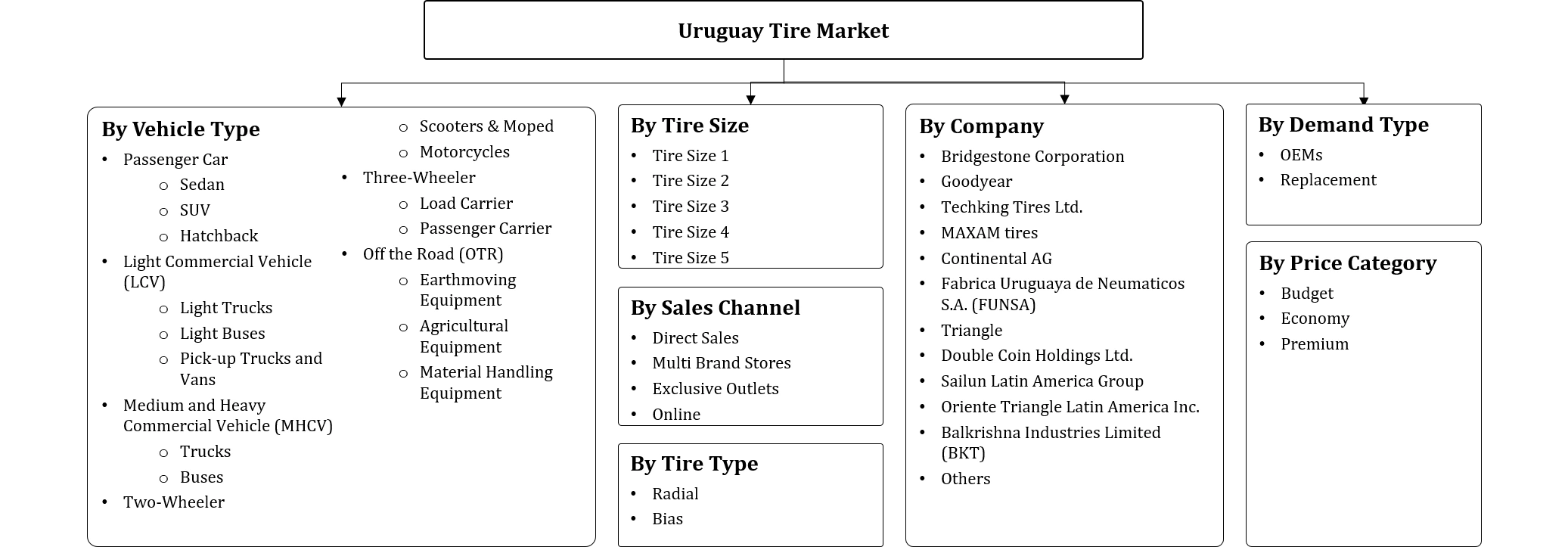 Uruguay Tire Market - By Vehicle Type (Passenger Car, Light Commercial Vehicle (LCV), Medium and Heavy Commercial Vehicle (MHCV), Two-Wheeler, Three-Wheeler, Off the Road (OTR)),ByDemand Type (OEMs, R... ... Demand Type (OEMs, Replacement), By Price Category (Budget, Economy, Premium), By Tire Type (Radial, Bias), By Sales Channel (Direct Sales, Multi Brand Stores, Exclusive Outlets, Online), By Tire Size (Tire Size 1, Tire Size 2, Tire Size 3, Tire Size 4, Tire Size 5), and Others Read more