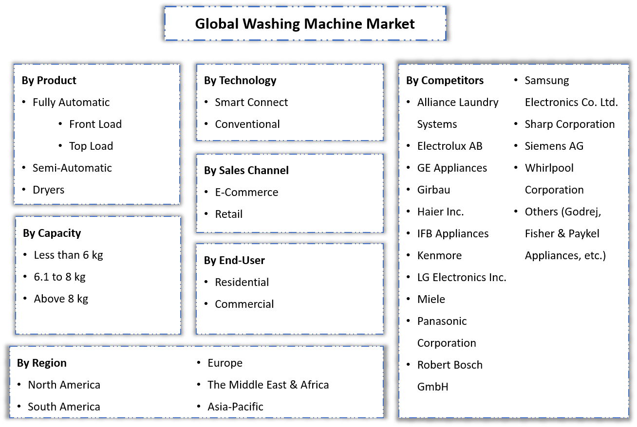 | Top Key Players | Alliance Laundry Systems, Electrolux AB, GE Appliances, Girbau, Haier Inc., IFB Appliances, Kenmore, LG Electronics Inc., Miele, Panasonic Corporation, Robert Bosch GmbH, Samsung Electronics Co. Ltd., Sharp Corporation, Siemens AG, Whirlpool Corporation, Godrej, and Fisher & Paykel Appliances, and others |