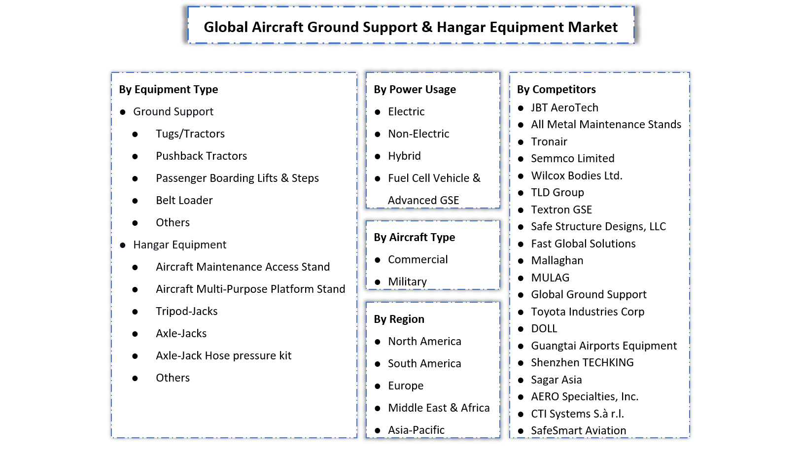 By Equipment Type (Ground Support [Tugs/Tractors, Pushback Tractors, Passenger Boarding Lifts & Steps, Belt Loader, Others], Hangar Equipment [Aircraft Maintenance Access Stand, Ai......rcraft Multi-Purpose Platform Stand, Tripod-Jacks, Axle-Jacks, Axle-Jack Hose pressure kit, Others]), By Power Usage (Electric, Non-Electric, Hybrid, Fuel Cell Vehicle & Advanced GSE), By Aircraft Type (Commercial, Military), By Region (North America, South America, Europe, Middle East & Africa, Asia-Pacific), By Competitors (JBT AeroTech, All Metal Maintenance Stands, Tronair, Semmco Limited, Wilcox Bodies Ltd., TLD Group, Textron GSE, Safe Structure Designs, LLC, Fast Global Solutions, Mallaghan, MULAG, Global Ground Support, Toyota Industries Corp, DOLL, Guangtai Airports Equipment, Shenzhen TECHKING, Sagar Asia , AERO Specialties, Inc., CTI Systems S.à r.l., SafeSmart Aviation) Read more