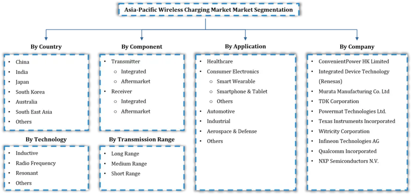 By Technology (Inductive, Radio Frequency, Resonant, Others), By Component (Transmitter, Receiver), By Transmission Range (Long Range, Medium Range, Short Range), By Application (H......ealthcare, Consumer Electronics [Smart Wearable, Smartphone & Tablet, Others], Automotive, Industrial, Aerospace & Defense, Others), By Country (China, Japan, South Korea, Australia, India, South East Asia), By Company (ConvenientPower HK Limited, Integrated Device Technology (Renesas), Murata Manufacturing Co. Ltd, TDK Corporation, Powermat Technologies Ltd., Texas Instruments Incorporated, Witricity Corporation, Infineon Technologies AG, Qualcomm Incorporated, NXP Semiconductors N.V. etc.) Read more