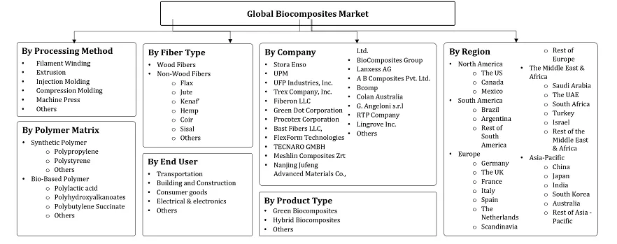 Biocomposites Market - By Processing Method (Filament Winding, Extrusion, Injection Molding, Compression Molding, Machine Press, Others), By Polymer Matrix (Synthetic Polymer [Poly......propylene, Polystyrene, Others], Bio-Based Polymer [Polylactic acid, Polyhydroxyalkanoates, Polybutylene Succinate, Others]), By Product Type (Green Biocomposites, Hybrid Biocomposites, Others), By Fiber Type (Wood Fibers, Non-Wood Fibers, Flax, Jute, Kenaf’, Hemp, Coir, Sisal, Others]), By End User (Transportation, Building and Construction, Consumer goods, Electrical & electronics) and Others Read more
