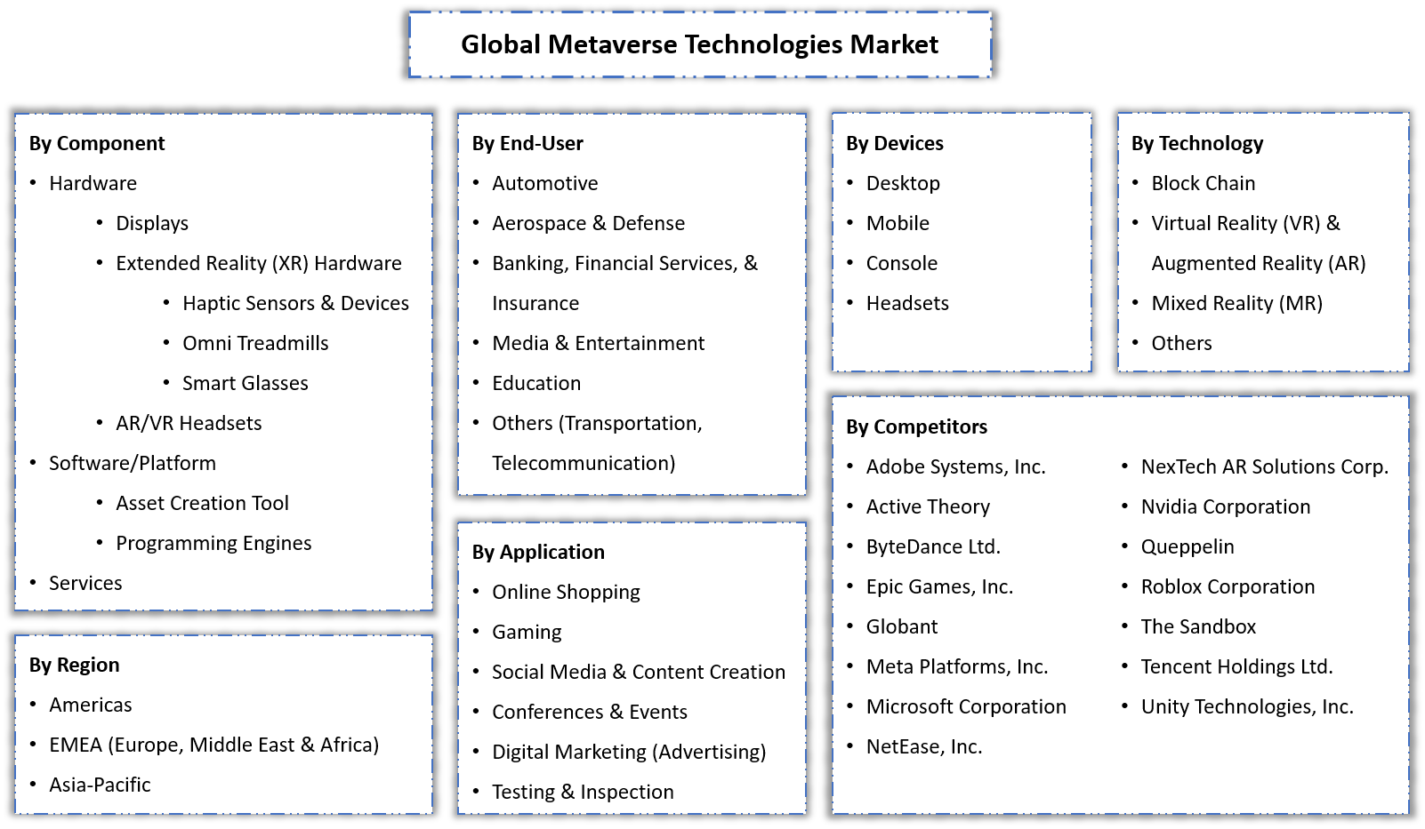 | Key Companies Profiled | Active Theory, ByteDance Ltd., Epic Games, Inc., Globant, Meta Platforms, Inc., Microsoft Corporation, NetEase, Inc., NexTech AR Solutions Corp., Nvidia Corporation, Queppelin, Roblox Corporation, The Sandbox, Tencent Holdings Ltd, Unity Technologies, Inc. |