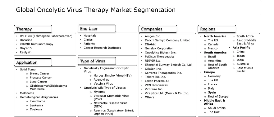 | Key Companies Profiled | Amgen Inc., Daiichi Sankyo Company Limited, DNAtrix, Genelux Corporation, Oncolytics Biotech Inc., PsiOxus Therapeutics, RIGVIR Ltd., Shanghai Sunway Biotech Co. Ltd., SillaJen Inc., Sorrento Therapeutics Inc., Takara Bio Inc., Lokon Pharma AB, VCN Biosciences, ViroCure Inc., Viralytics Ltd. (Merck & Co. Inc.) |