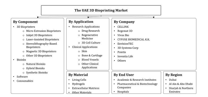 UAE 3D Bioprinting Market - By Component (3D Bioprinters [Micro Extrusion Bioprinters, Inkjet 3D Bioprinters, Laser-Assisted Bioprinters, Stereolithography-Based Bioprinters, Magne......tic 3D Bioprinters, Other 3D Bioprinters], Bioinks [Natural Bioinks, Hybrid Bioinks, Synthetic Bioinks], Software, Consumables), By Material (Living Cells, Hydrogels, Extracellular Matrices, Other Materials), By Application (Research Applications [Drug Research, Regenerative Medicine, 3D Cell Culture], Clinical Applications [Skin, Bone & Cartilage, Blood Vessels, Other Clinical Applications]), By End User (Academic & Research Institutes, Pharmaceutical & Biotechnology Companies, Hospitals) and others Read more
