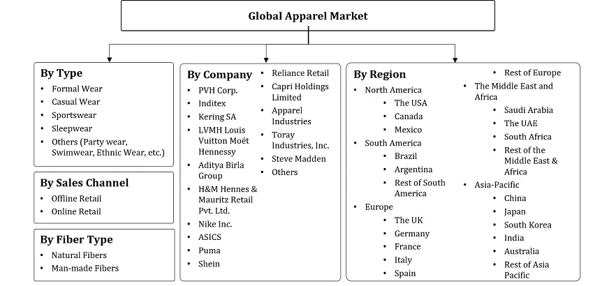 | Segmentation | By Type (Formal Wear, Casual Wear, Sportswear, Sleepwear, Others), By Fiber Type (Natural Fibers [Animal Fibers, Mineral Fibers, Plant/Vegetable Fibers- Min...eral Fibres], Man-made Fibers [Synthetic Fibers, Artificial/Regenerated Fibers, Inorganic Fibers], By Distribution Channel (Online Retail, Offline Retail [Fashion Stores, Shopping Malls, Local Retail Stores]) and others |