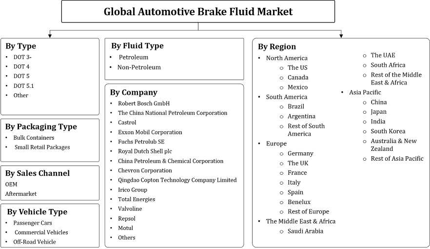 | Segmentation | By Type (DOT 3, DOT 4, DOT, DOT 5.1, Other) By Fluid Type (Petroleum, Non-Petroleum) By Vehicle Type, Passenger Cars, Commercial Vehicles, Off-Road Vehicle) By Packaging Type (Bulk Containers, Small Retail Packages) By Sales Channel (OEM, Aftermarket) and Others |
