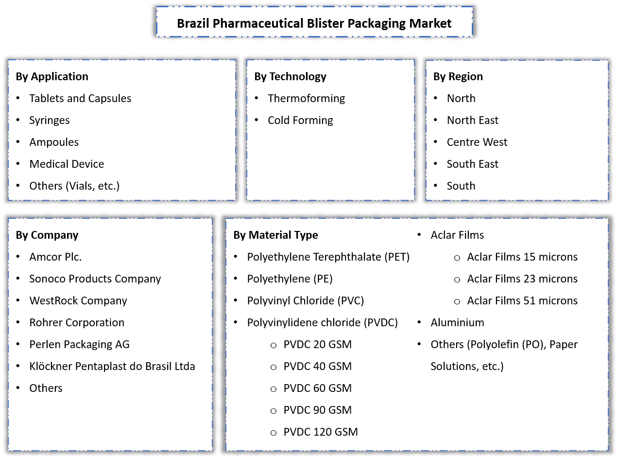 By Material Type (Polyethylene Terephthalate (PET), Polyethylene (PE), Polyvinyl Chloride (PVC), Polyvinylidene chloride (PVDC) (PVDC 20 GSM, PVDC 40 GSM, PVDC 60 GSM, PVDC 90 GSM, PVDC 120 GSM), Acla... ... PVDC 120 GSM), Aclar Films (Aclar Films 15 microns, Aclar Films 23 microns, Aclar Films 51 microns), Aluminium, Others (Polyolefin (PO), Paper Solutions, etc.)), By Technology (Thermoforming, Cold Forming, Application, Tablets and Capsules, Syringes, Ampoules, Medical Device, Others (Vials, etc.)), By Region (North, North East, Centre West, South East, South), By Company (Amcor Plc., Sonoco Products Company, WestRock Company, Rohrer Corporation, Perlen Packaging AG, Klöckner Pentaplast do Brasil Ltda, Others) Read more
