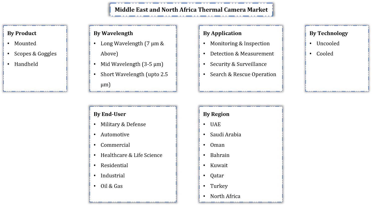 By Product (Mounted, Scopes & Goggles, Handheld), By Wavelength (Long Wavelength (7 µm & Above), Mid Wavelength (3-5 µm), Short Wavelength (up to 2.5 µm)), By Technology (Uncooled, Cooled), By End-Use... ... ed, Cooled), By End-User (Military & Defense, Automotive, Commercial, Healthcare & Life Science, Residential, Industrial, Oil & Gas), By Application (Monitoring & Inspection, Detection & Measurement, Security & Surveillance, Search & Rescue Operation), By Country (UAE, Saudi Arabia, Oman, Bahrain, Kuwait, Qatar, Turkey, North Africa), By Competitors (Flir System, Thermoteknix Systems Ltd., Leonardo S.p.A., Synectics plc, Seek Thermal, InfraTec GmbH Infrarotsensorik, Axis Communications AB, Opgal Optronic Industries Ltd.) Read more