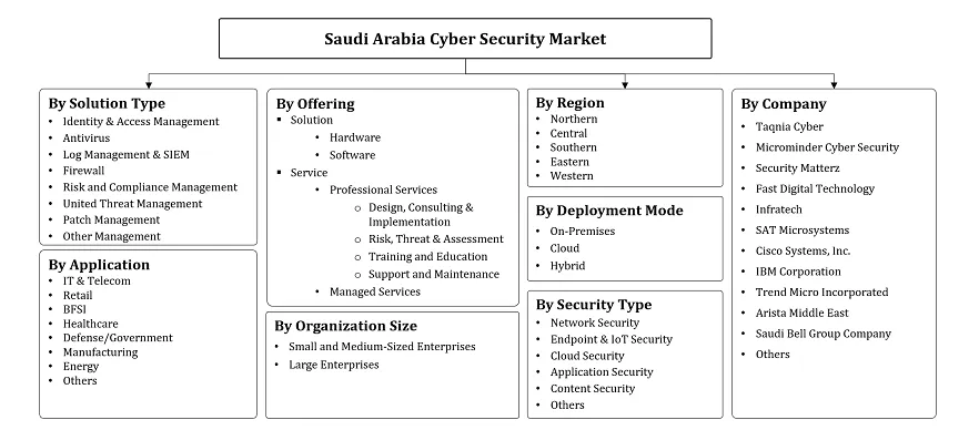 Saudi Arabia Cyber Security Market - By Offering (Solution, Hardware, Firewall, United Threat Management, Intrusion Prevention System, Software, Identity & Access Management, Antivirus, Log Manage... ... ntivirus, Log Management & SIEM, Risk and Compliance Management, Patch Management, Other Management, Service, Professional Services, Design, Consulting & Implementation, Risk, Threat & Assessment, Training and Education, Support and Maintenance, Managed Services), By Security Type (Network Security, Endpoint & IoT Security, Cloud Security, Application Security, Content Security, Others), By Deployment Mode (On-Premises, Cloud, Hybrid), By Organization Size (Small and Medium-Sized Enterprises, Large Enterprises), By Application (IT & Telecom, Retail, BFSI, Healthcare, Defense/Government, Manufacturing, Energy, Others, and others Read more