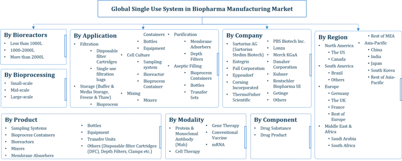 By Bioreactors (Less than 1000L, 1000-2000L, More than 2000L), By Product (Single Use Sampling System, Automated Sampling Solutions, Off-line Single Use Sampling Solutions, Reusable Manual Sampling So... ... e Manual Sampling Solutions), By Bioprocess Containers (Containers, Connectors, Tubing), Bioreactors, Mixers, Bottles (Bottles, Bottle Assemblies), Transfer Sets (Single Use Connectors, Single Use Aseptic Connectors, Disconnectors, Single Use Aseptic Disconnectors, Tubes & Assemblies, Biowelder/Biosealer), Others (Single use sensors, disposable filter cartridges), By Application (Filtration (Disposable filter Cartridges, Single use filtration bags), Storage (Media and Buffer, Freeze & Thaw)(Bioprocess Containers, Bottles, Equipment), Cell Culture (Single use Sampling system, Bioreactor, Bioprocess Containers), Mixing (Mixers), Purification (Membrane Adsorbers, Depth Filters), Aseptic Filling (Bioprocess Containers, Bottles, Transfer Sets), By Bioprocessing (Small-scale, Mid-scale, Large-scale), By Modality (Protein & Monoclonal Antibody (Mab), Cell Therapy, Gene Therapy, Conventional Vaccine, mRNA), By Component (Drug Substance, Drug Product), By Region (North America, South America, Europe, Middle East & Africa, Asia-Pacific) Read more