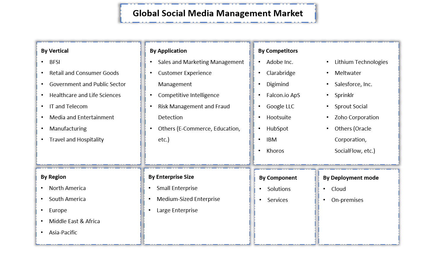 By Component (Solutions, Services), By Deployment mode (Cloud, On-premises), By Enterprise Size (Small Enterprise, Medium-Sized Enterprise, Large Enterprise), By Application (Sales and Marketing Manag... ... and Marketing Management, Customer Experience Management, Competitive Intelligence, Risk Management and Fraud Detection, Others [E-Commerce, Education, etc.]), By Vertical (BFSI, Retail and Consumer Goods, Government and Public Sector, Healthcare and Life Sciences, IT and Telecom, Media and Entertainment, Manufacturing, Travel and Hospitality), By Region (North America, South America, Europe, The Middle East & Africa), Asia-Pacific, By Company (Adobe Inc., Clarabridge, Digimind, Falcon.io ApS, Google LLC, Hootsuite, HubSpot, IBM, Khoros, Lithium Technologies, Meltwater, Salesforce, Inc., Sprinklr, Sprout Social, Zoho Corporation, Others [Oracle Corporation, SocialFlow, etc.]) Read more