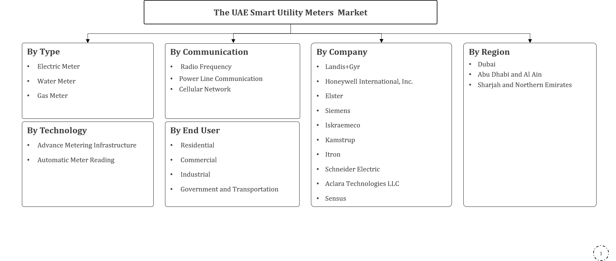 By Type (Electric Meter, Water Meter, Gas Meter) By Technology (Advanced Metering Infrastructure, Automatic Meter Reading, By Communication Radio Frequency, Power Line Communication, Cellular Network)... ... n, Cellular Network) By End User (Residential, Commercial, Industrial, Government and Transportation) By Region (Dubai, Abu Dhabi & Al Ain, Sharjah and Northern Emirates) By Company (Landis+Gyr, Honeywell International, Inc., Elster, Siemens, Iskraemeco, Kamstrup, Itron, Schneider Electric, Aclara Technologies LLC, Sensus) Read more