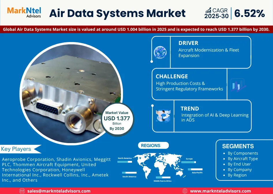 The Global Air Data Systems Market size is valued at around USD 1.004 billion in 2025 and is expected to reach USD 1.377 billion by 2030. Along with this, the market is estimated to grow at a CAGR of around 6.52% during the forecast period, i.e., 2025-30. The market growth is being fueled by the demand for more advanced aircraft systems, the development of automation & modernization in the aviation industry, and the expanding consequences of reliable information in the air. Additionally, the military aviation industry is anticipated to experience a considerable increase in recognition of unmanned aerial vehicles (UAVs) and additional cutting-edge aircraft. Hence, the rising demand for novel aircraft by airlines & army forces around the globe is the critical factor boosting the market growth & expansion.