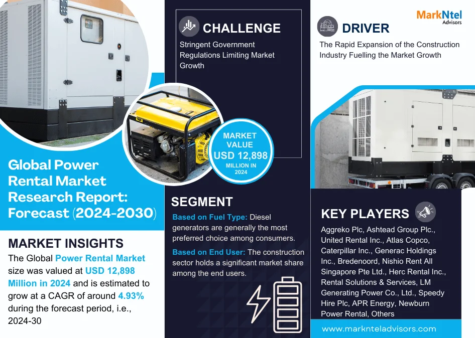 - Global Power Rental Market Report by MarkNtel Advisors provides a detailed & thorough analysis of market size & share, growth rate, competitive landscape, and key players. This comprehensive analysis helps business organizations to gain a holistic understanding of the market dynamics & make informed decisions.